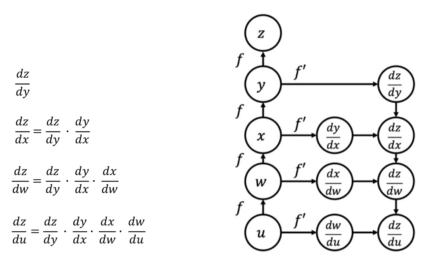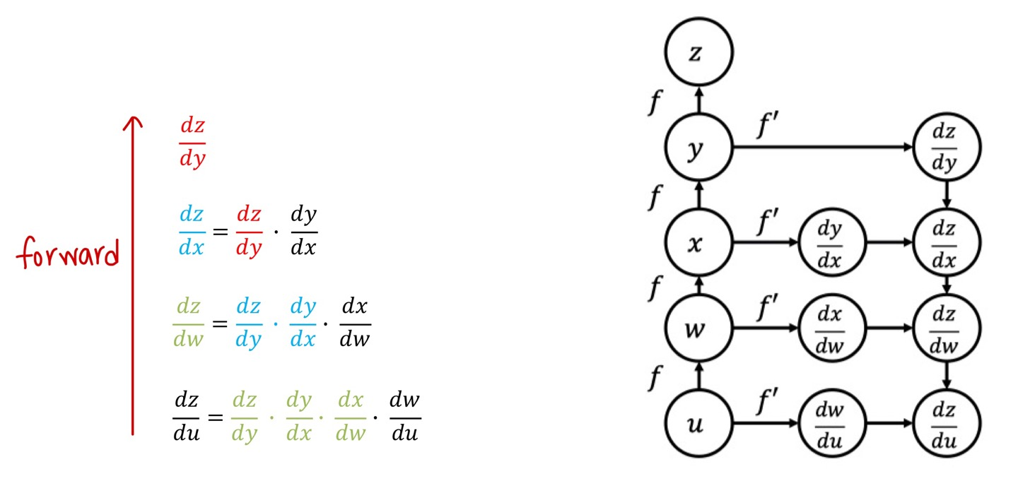 따라서 전부 다 연산을 하는 게 아니라 recursive하게 연산하면 일부만 새로 계산해도 최종적인 도함수까지 구할 수 있게 됩니다.