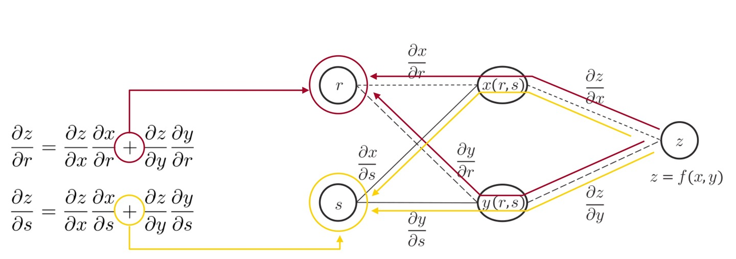 구조를 보면 입력 변수는 두 개(u와 v) 이고 중간 변수도 두 개(x와 y)로 그림으로 나타내면 위와 같습니다.