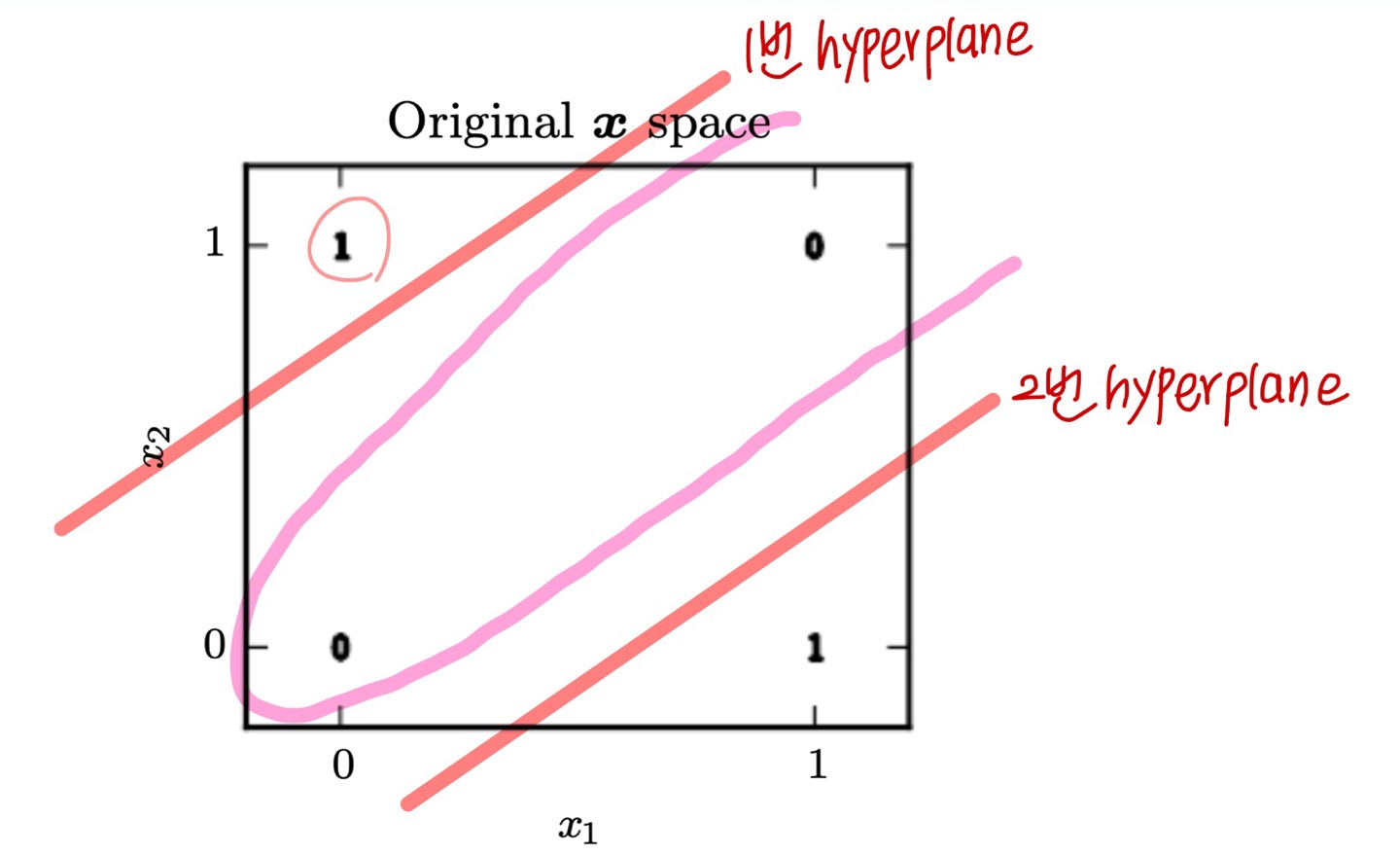 1번 hyperplane과 2번 hyperplane 즉 2개의 hyperplane을 두면 XOR 문제를 해결할 수 있지 않을까 하는 대안이 나오게 됩니다.