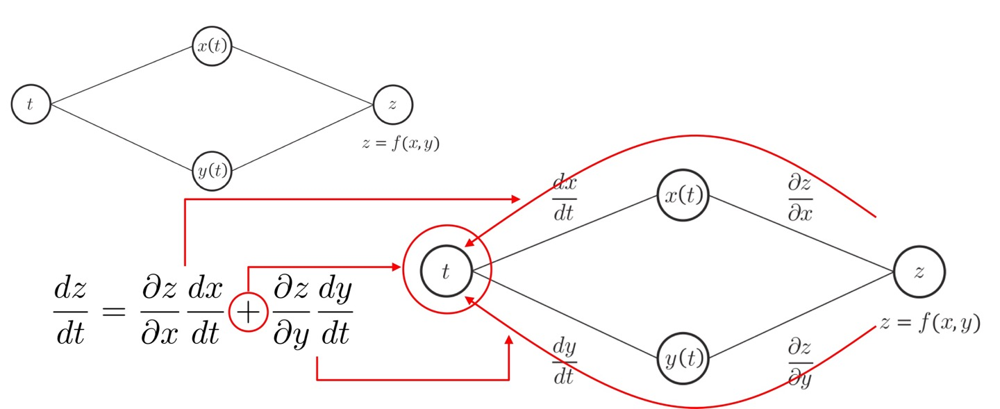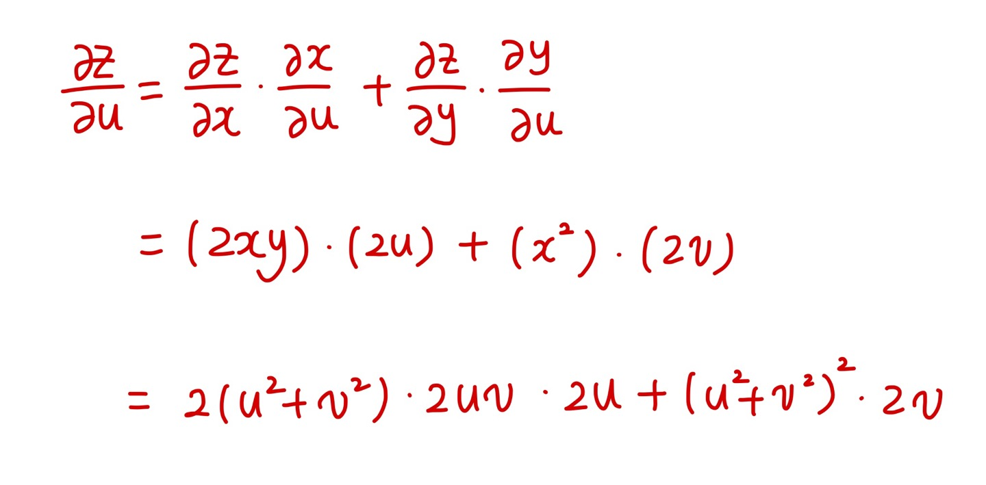 그러므로 (z의 x에 대한 미분값 * x의 u에 대한 미분값) + (z의 y에 대한 미분값 * y의 u에 대한 미분값) 이렇게 하면 되겠죠?