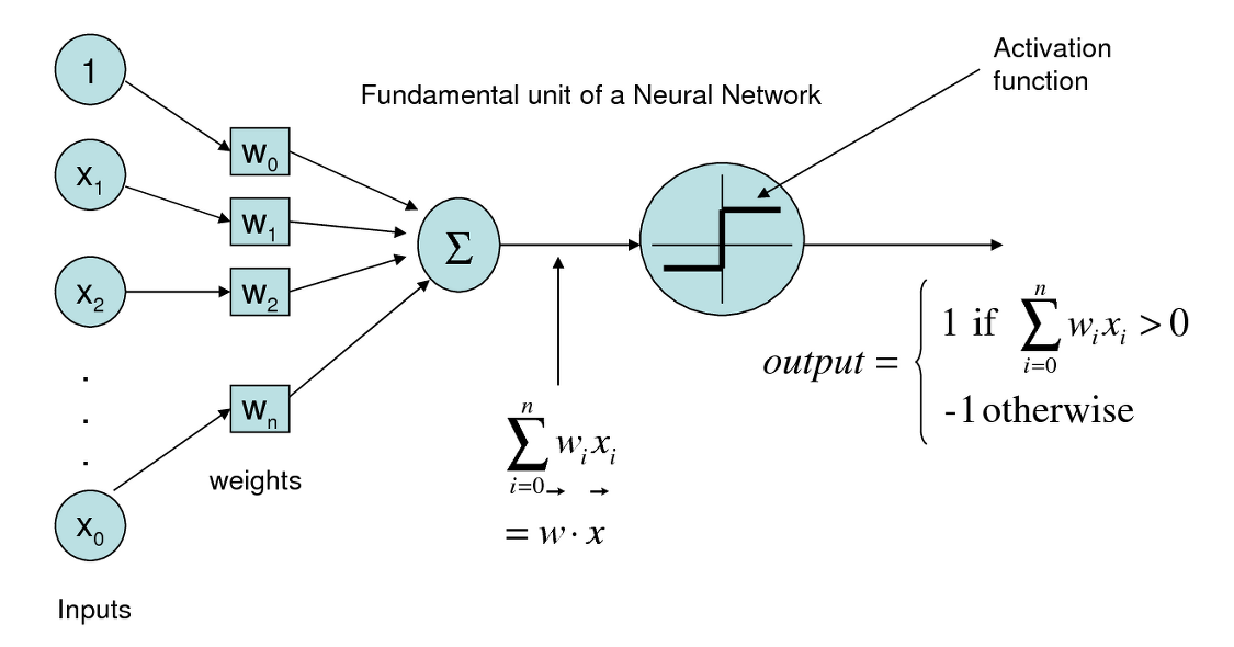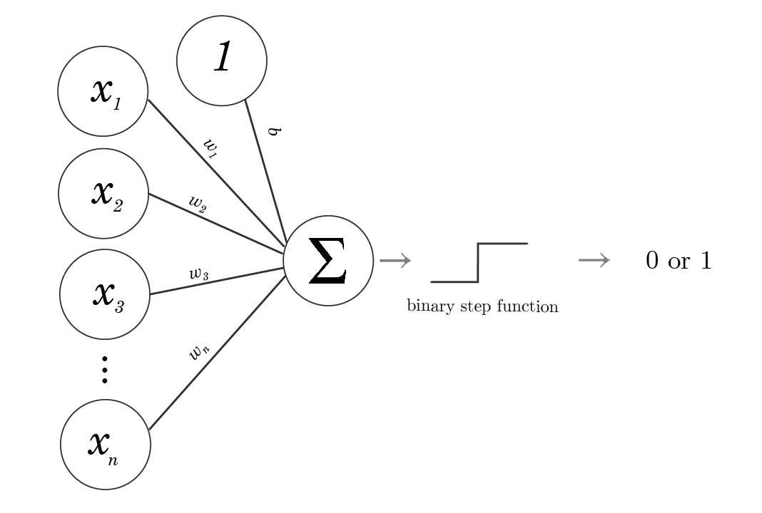 input 데이터가 있고 각각의 데이터에 해당하는 weight가 있어서 주어진 input 데이터와 weight를 결합(연산)해서 그 값이 일정 thresholds를 넘느냐 넘지 않느냐로 분류하는 과정입니다.