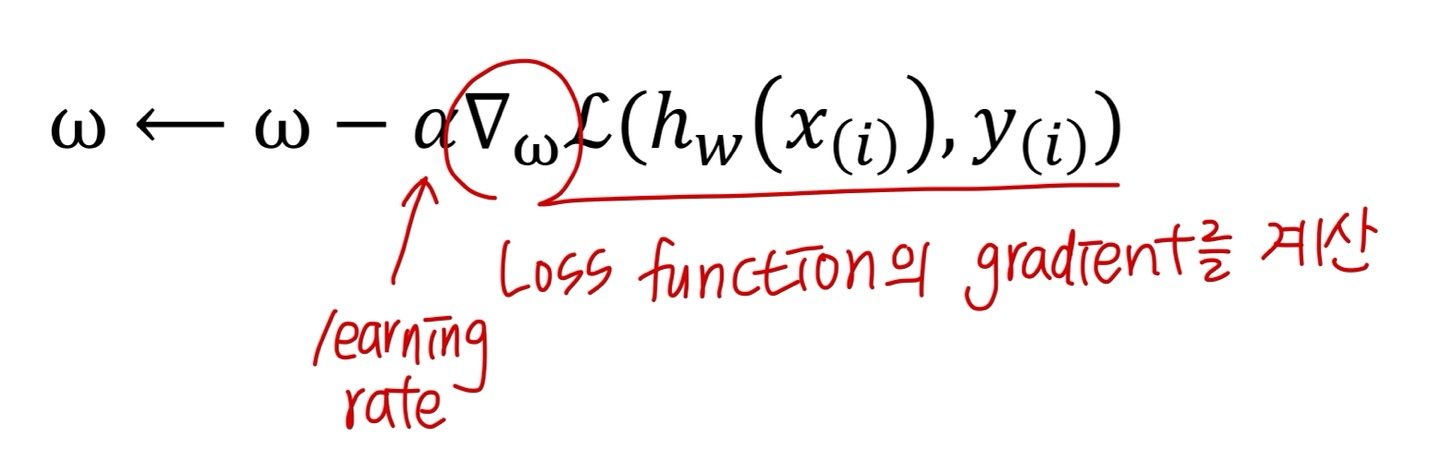 - loss function의 미분값(기울기)가 감소하는 방향으로 점진적으로 이동