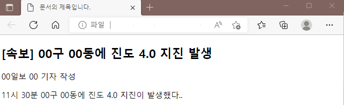 <h1>[속보] 00구 00동에 진도 4.0 지진 발생</h1>