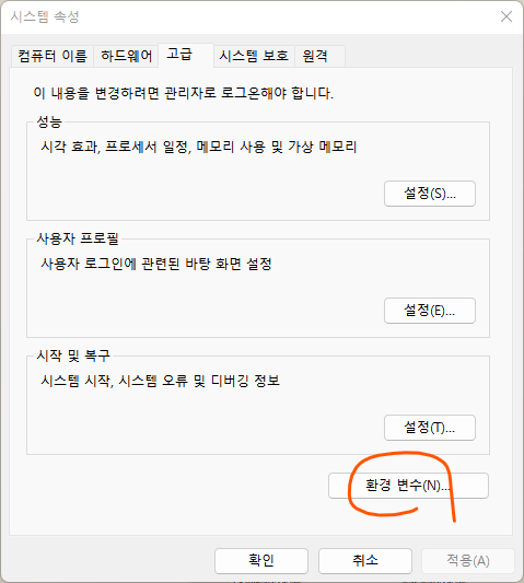 윈도우 검색에서 '시스템 환경 변수 편집'을 입력 후 클릭하고 하단에 환경 변수를 클릭해 줍니다.
