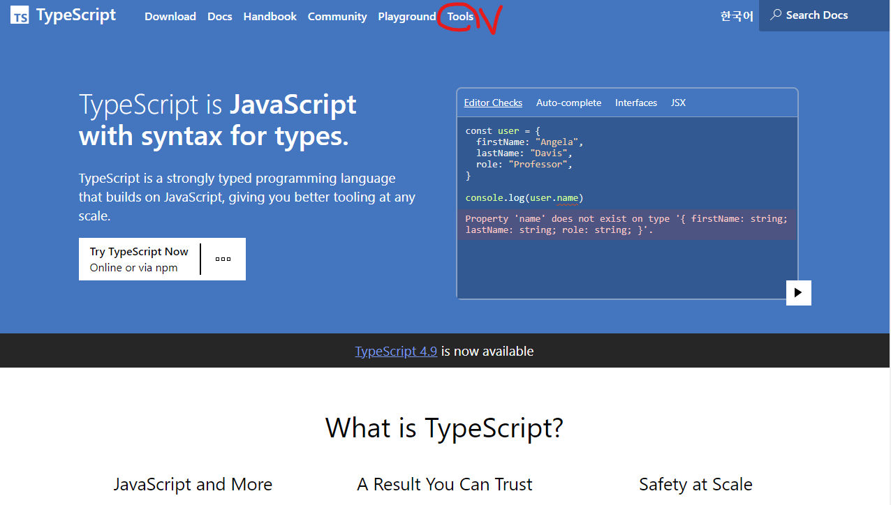 이렇게 타입스크립트 코드를 자바스크립트 코드로 변환할 때 필요한 도구가 타입스크립트 컴파일러입니다!