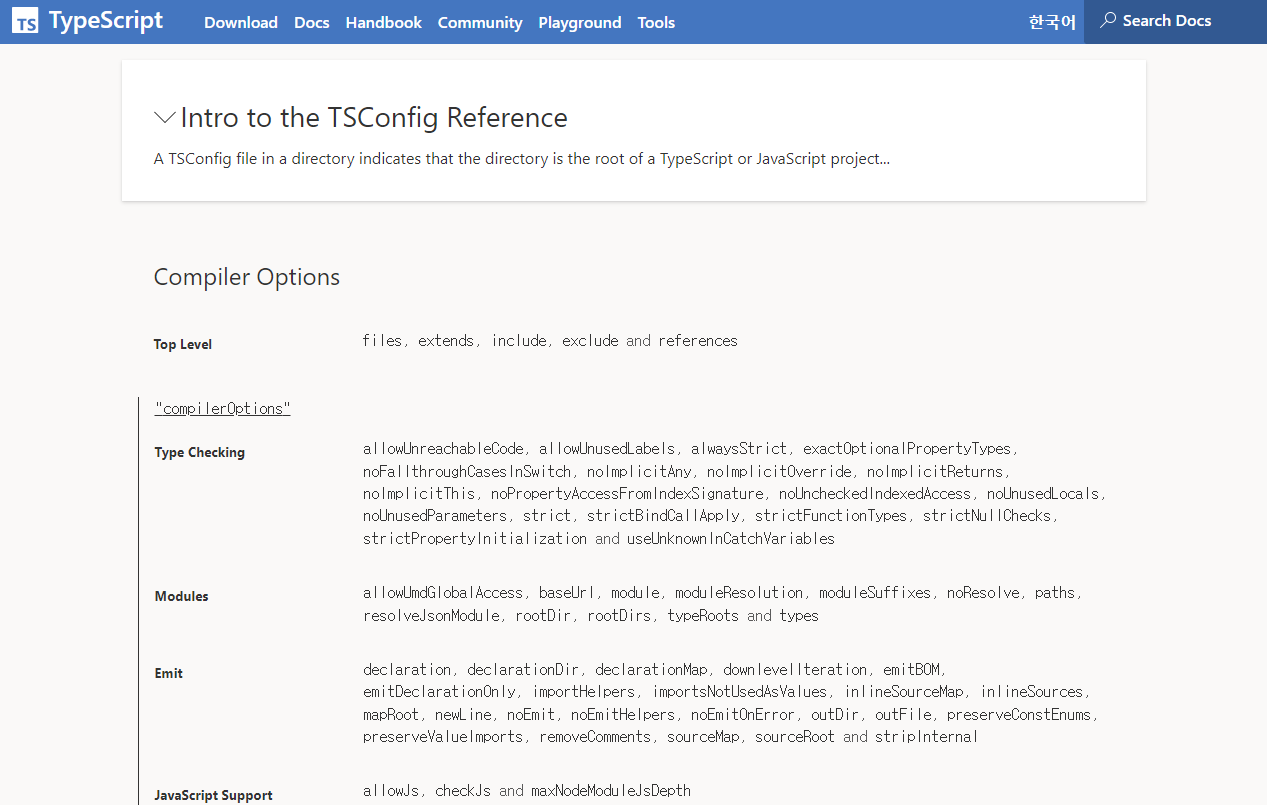 더 많은 옵션들에 대한 설명은 타입스크립트 공식 홈페이지에 있습니다.