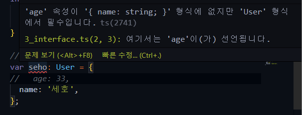 만약 우리가 미리 약속한 User 인터페이스와 맞지 않게 변수를 정의하게 되면 당연히 에러를 내겠죠?