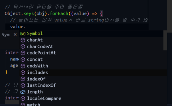 이때 키값이 딱 string이다라고 약속하게 되면 다음과 같이 그 타입에 맞게 적용할 수 있는 함수들을 바로 확인이 가능합니다.