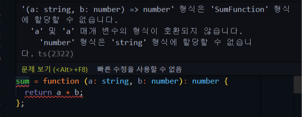 위 코드에서 a: number → a: string으로 변경해 보겠습니다.