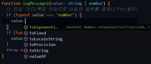 좁힌 타입에 맞는 메서드들을 보여주게 됩니다.