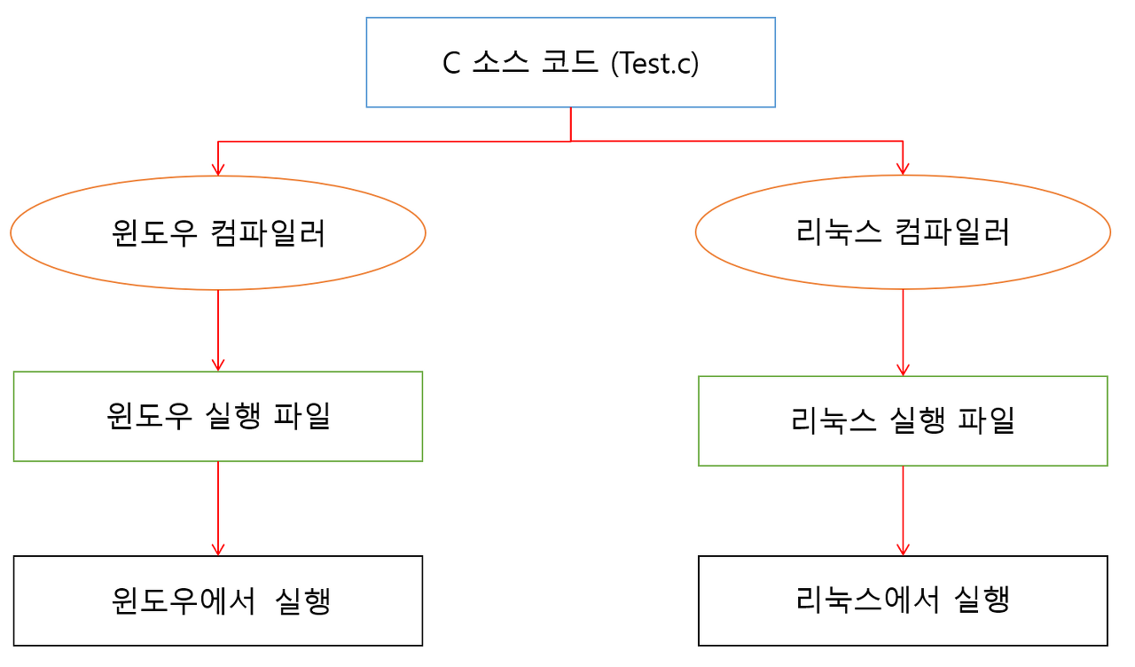 자바가 아니라면 윈도우 컴파일러를 사용해서 컴파일을 하면 윈도우에서만 실행이 되고, 리눅스 운영체제에서는 실행을 할 수가 없습니다.