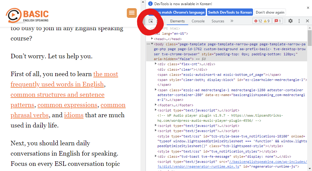 커서 모양의 버튼을 누른 후 화면에 마우스를 가져다 대면 해당하는 부분의 HTML 코드와 매칭해주게 됩니다.