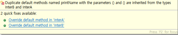 위 코드처럼 이번에는 클래스와 인터페이스에 이름과 매개변수가 같은 메소드가 선언되었을 때 이 둘을 동시에 상속받는 클래스를 살펴보려고 합니다.