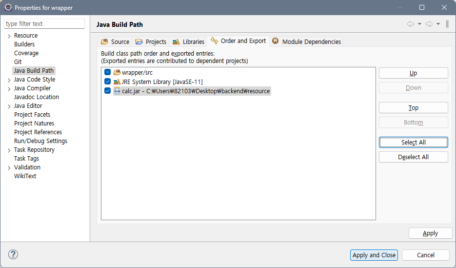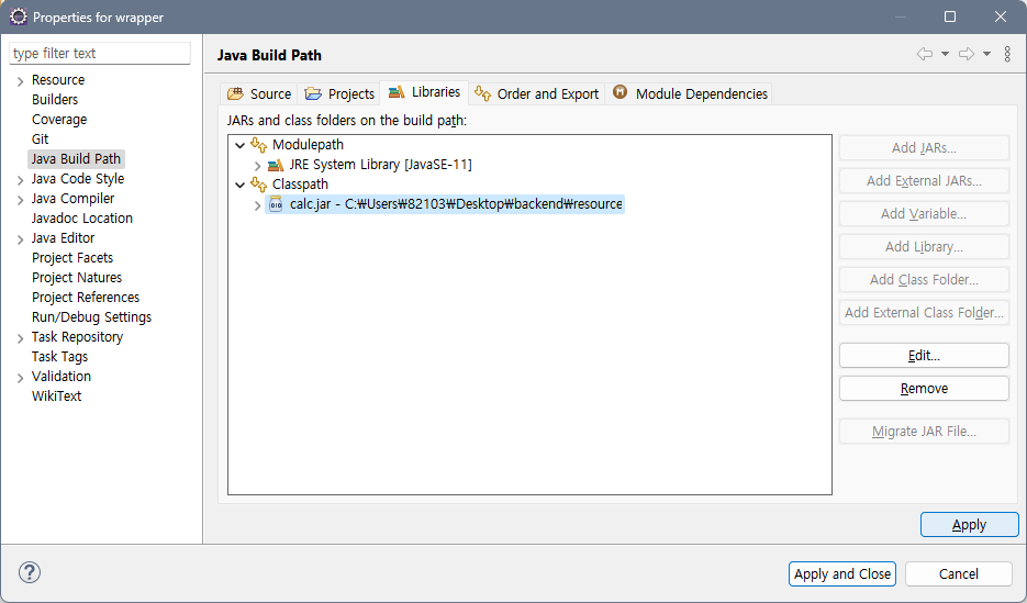 3. 저장된 경로의 .jar 파일을 더블 클릭으로 추가 → Apply 클릭(Apply and Close 아님!!!)