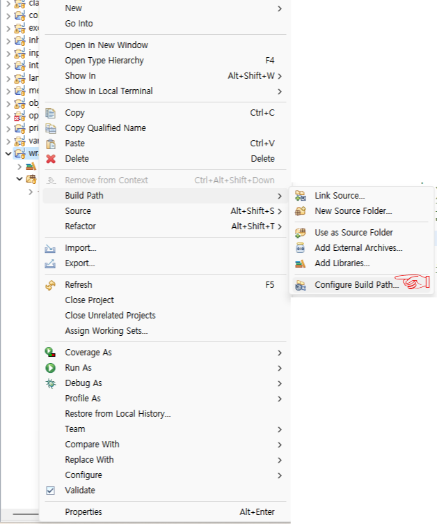 1. 프로젝트 우클릭 → Build Path 클릭 → Configure Build Path 클릭