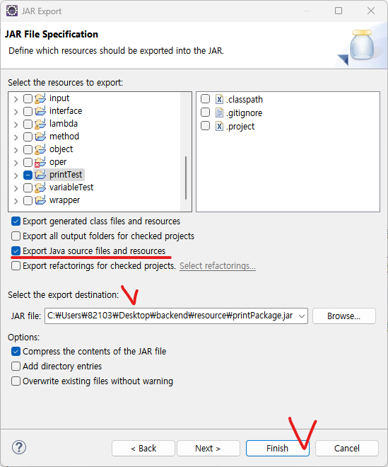 Finish하게 되면 선택한 경로에 입력한 파일명으로 jar 파일이 생성되게 됩니다.