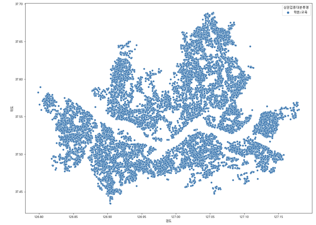 ▷서울 데이터를 '상권업종대분류명' 에서 '학문/교육'에 관련된 정보만 시각화