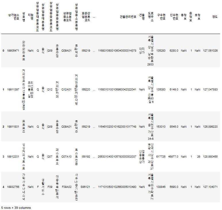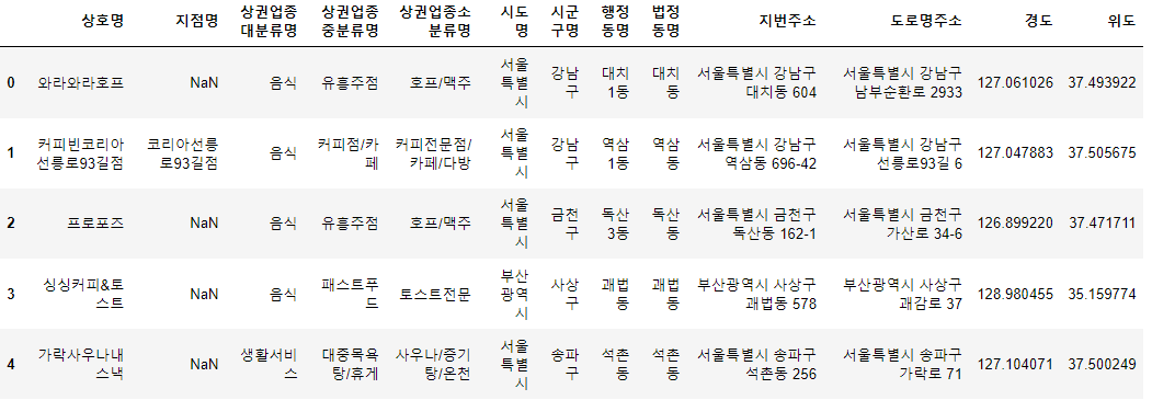 Index(['상가업소번호', '상호명', '지점명', '상권업종대분류코드', '상권업종대분류명', '상권업종중분류코드',