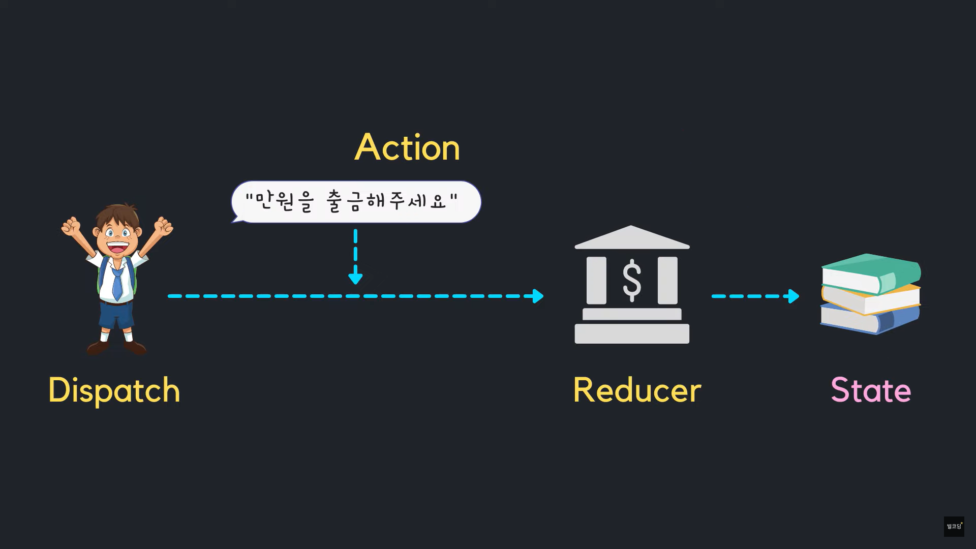 철수가 거래내역이라는 state를 변경하기 위해서는 dispatch에 action이라는 내용을 넣어서 reducer에게 전달해줘야 합니다.