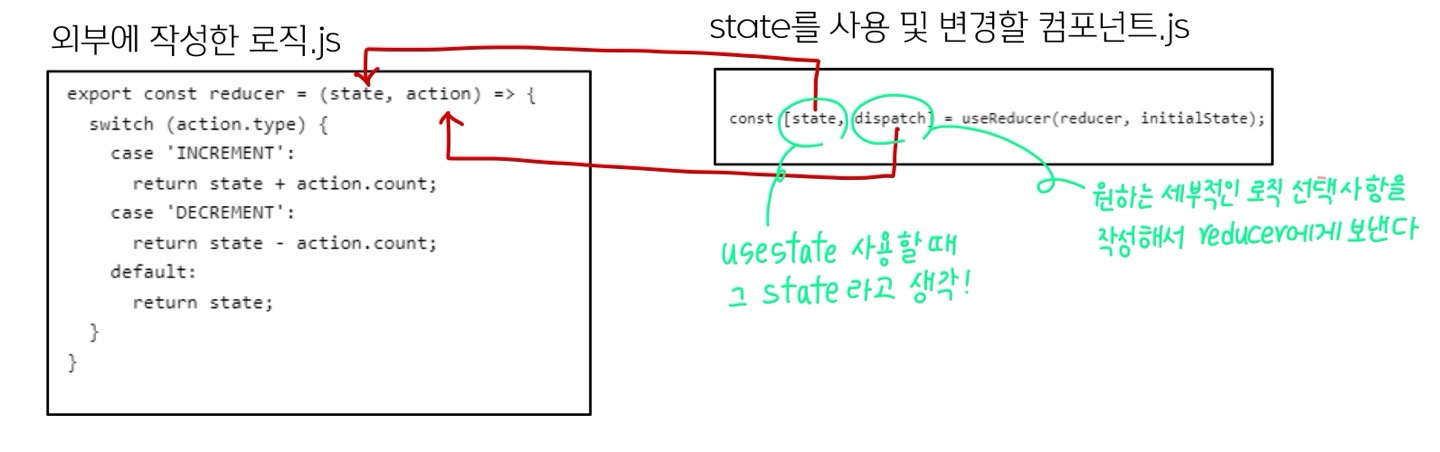 복잡한 상태 업데이트 로직을 컴포넌트 안에서 관리하지 말고 바깥에 따로 빼서 관리할 수 있도록 하는 것!