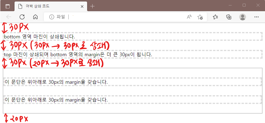 <p>top 마진이 상쇄되며 bottom 영역의 margin은 더 큰 30px이 됩니다.</p>