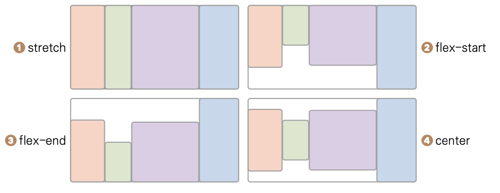 align-items: strech | flex-start | flex-end | center | baseline | first baseline |