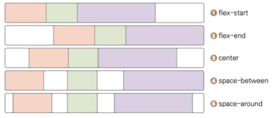 justify-content: flex-start | flex-end | center | space-between | space-around |