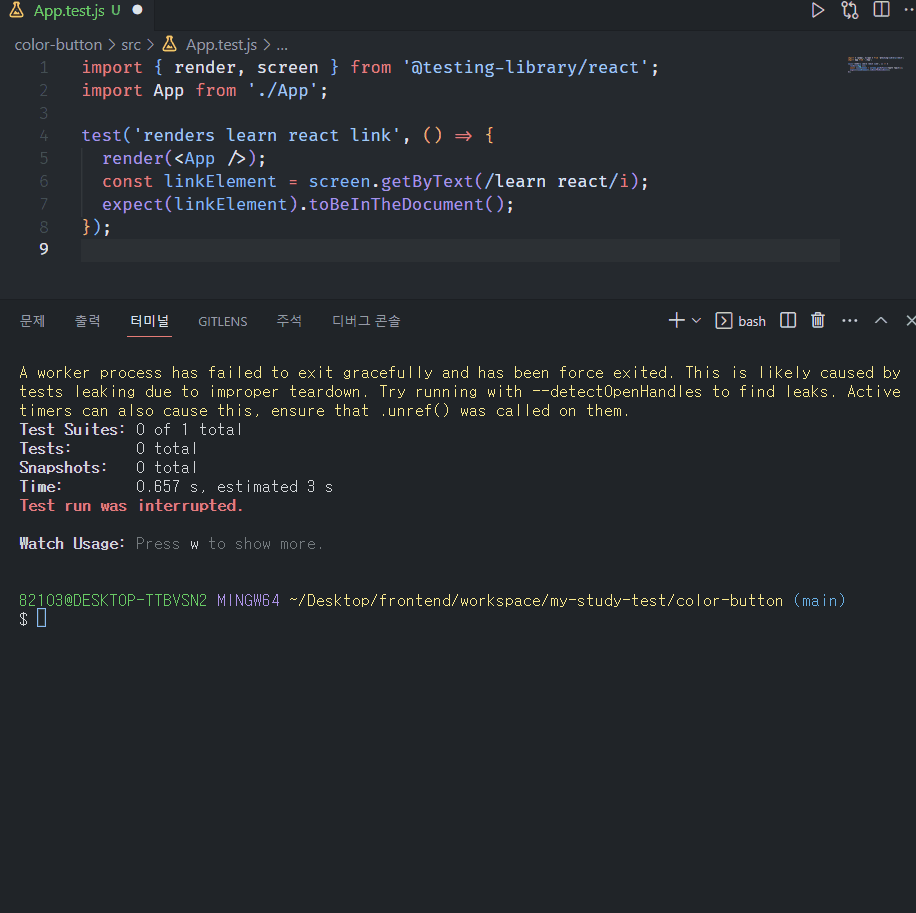 아래 화면은 제가 learn testing library라는 텍스트를 찾으라고 했습니다(일부로 없는 것을 입력하여 실패하도록 했습니다).