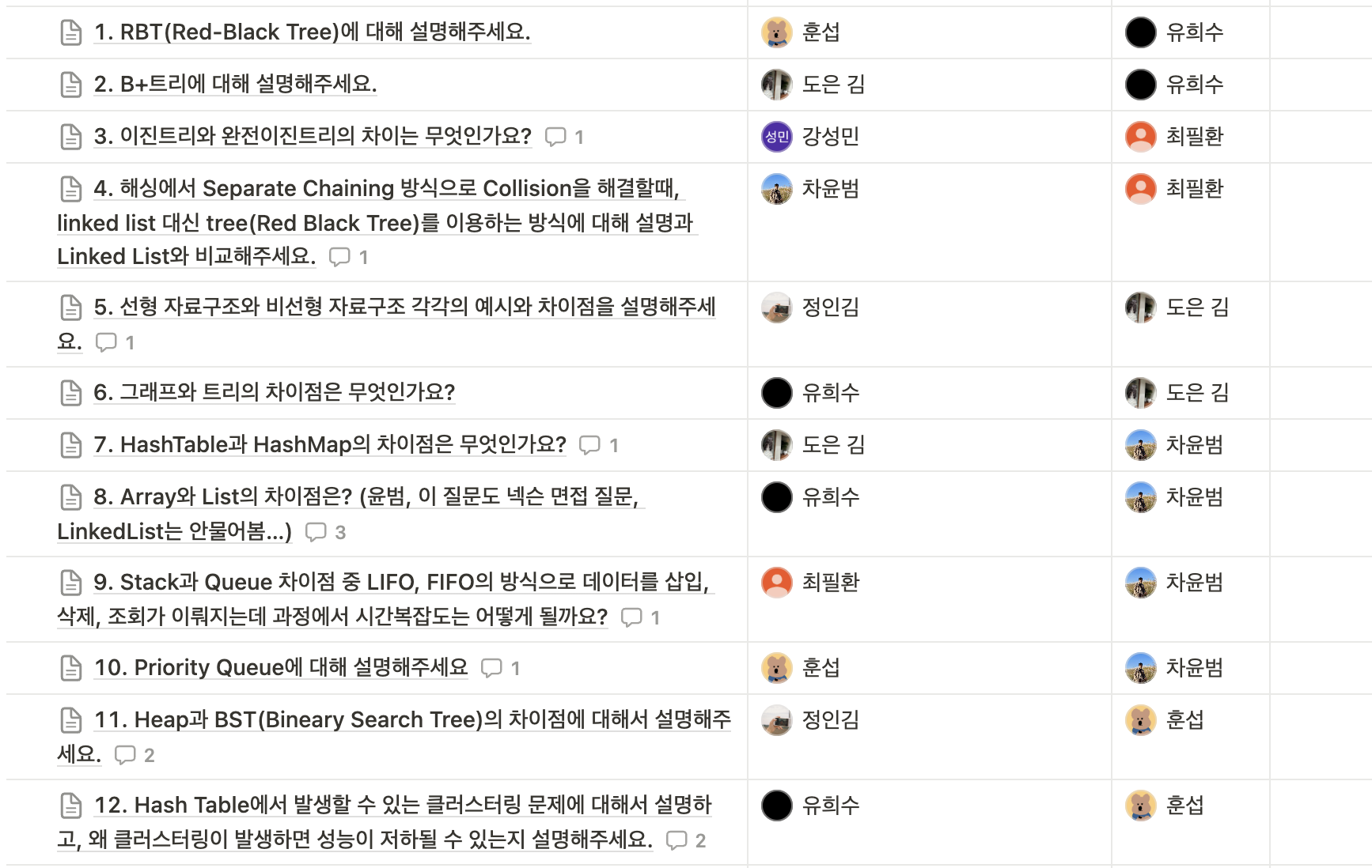 그래서 스터디 모임날에는 순서대로 답변자가 질문을 읽고 답변하고 필요하다면 질문자는 의도를 설명해주는 시간으로 스터디를 진행했습니다. 중간중간에 질문자 분이 직접 면접 때 받은 질문이라고 소개해주시면서 정보 공유도 하고 좋더라구요.