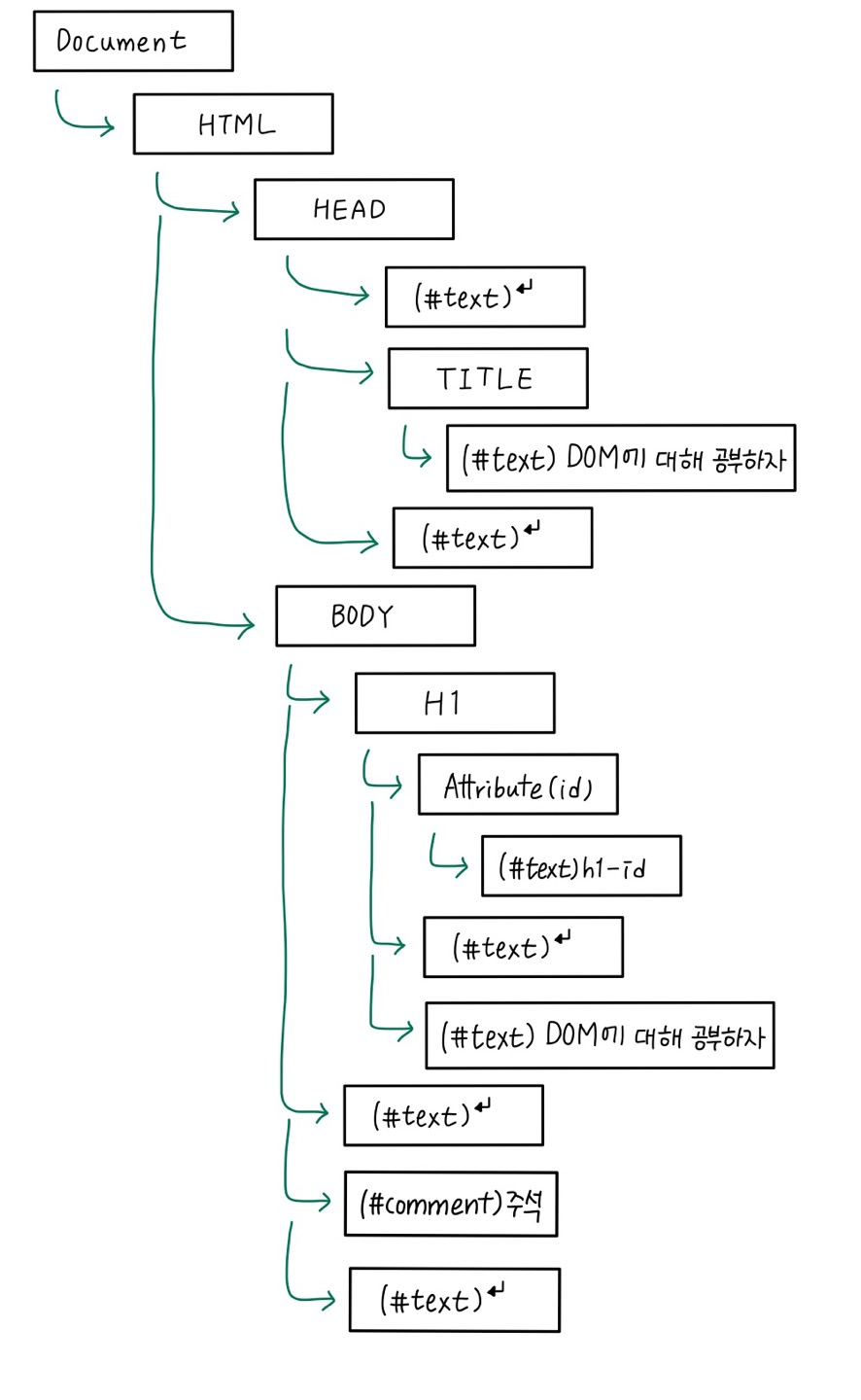 트리의 시작점은 Document이며 각각 노드의 타입에 따라 Element 노드, Text 노드, Attr 등으로 분류되어 계층 구조를 가집니다.