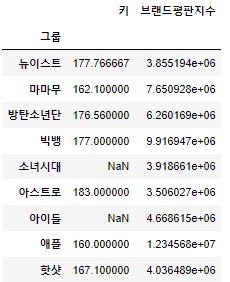 출력된 것을 보게 되면, 그룹별로 키와 브랜드평판지수의 평균이 구해졌음을 확인할 수 있습니다.