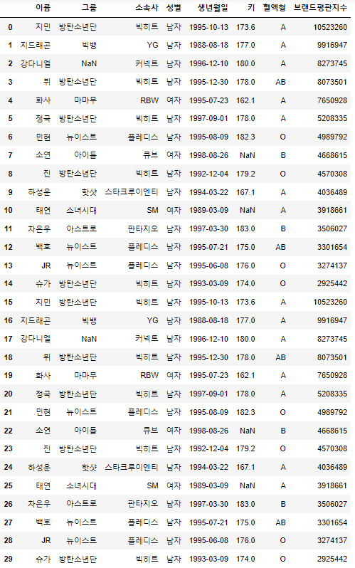 df.append({'이름':'김사과','그룹':'애플','소속사':'apple','성별':'여자','생년월일':'2000-01-01','키':160,'혈액형':'A','브랜드평판지수':12345678},ignore_index=True)