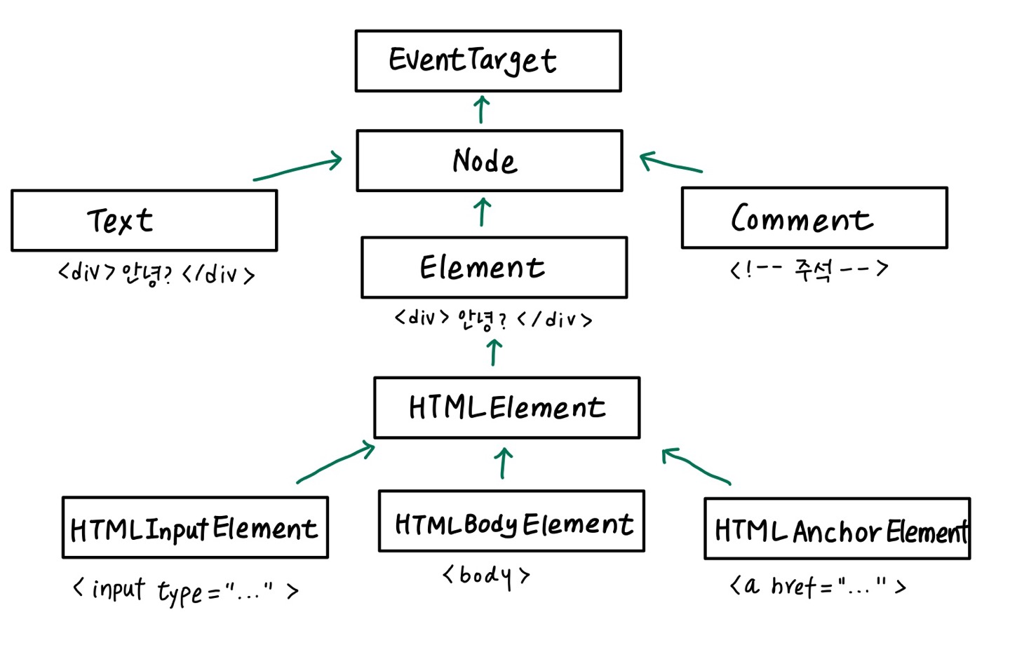 위 그림에서 알 수 있듯이 계층 구조의 제일 꼭대기에는 EventTarget이 존재합니다.