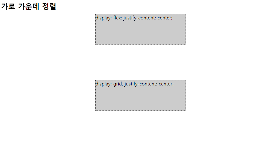 <section class="div-h-1"><div>display: flex; justify-content: center;</div></section>