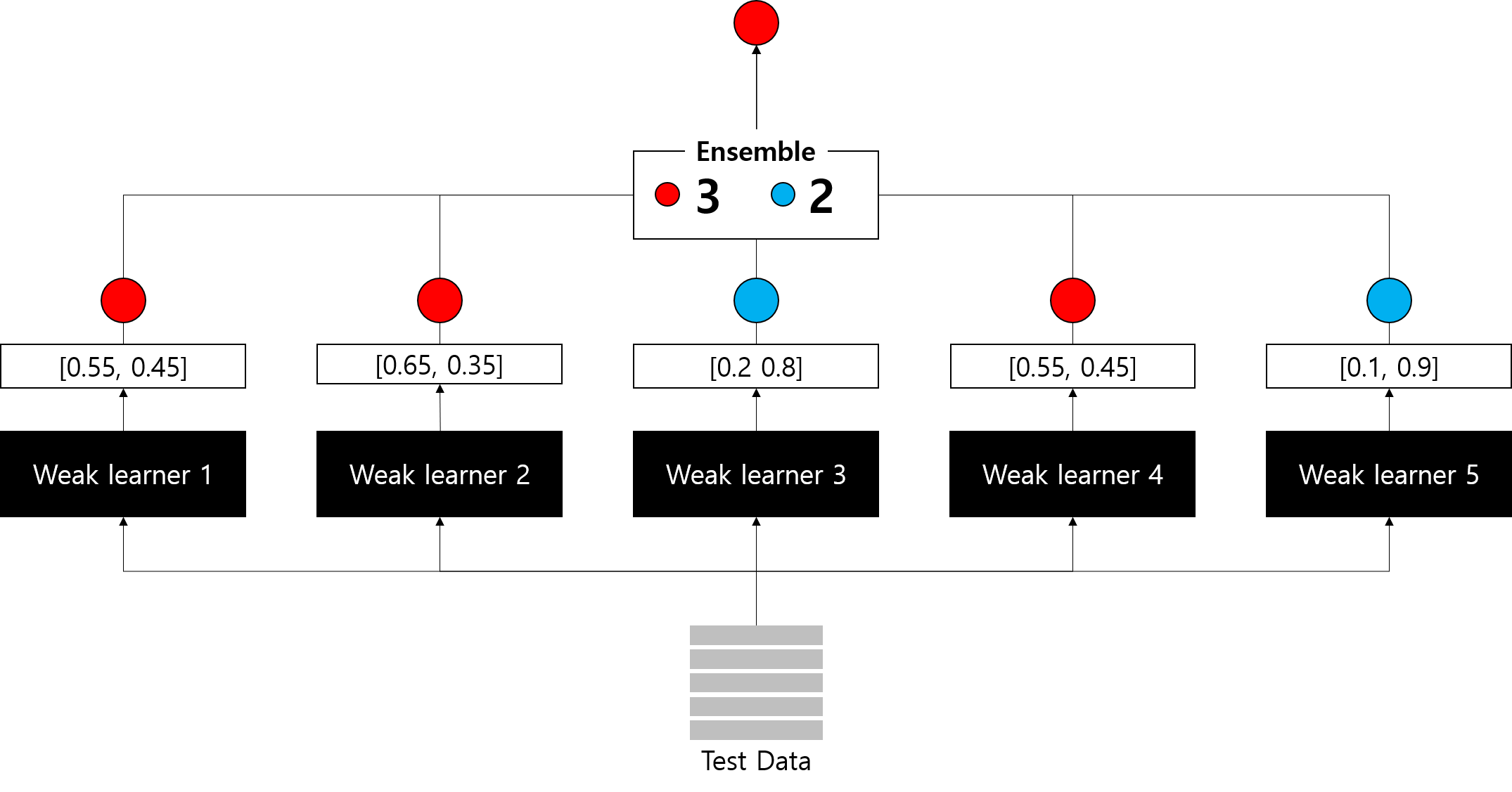 - class 1이 나올 최종 확률 : (0.6 + 0.1 + 0.1 + 0.6 + 0.6) / 5 = 0.4