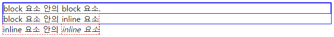 실행 결과는 다음과 같습니다. 실선이 블록 요소, 점선이 인라인 요소입니다.