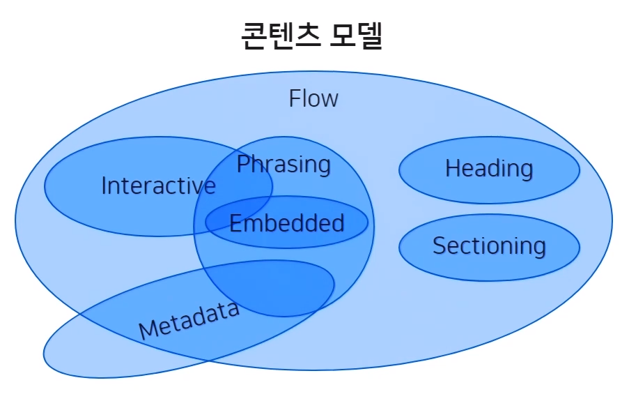 HTML5에서는 요소가 어떤 콘텐츠를 표현할 수 있는지, 어떤 하위 요소를 가지는지에 따라 Contents Model(콘텐츠 모델)로 분류합니다. 요소는 어떤 그룹에는 속하지 않거나 여러 그룹에 동시에 속합니다.