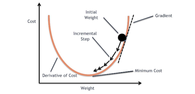비용함수의 기울기가 아래로 향하는 방향으로 계속 이동하다보면 비용함수의 최저점에 도달하게 되는데