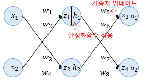 - 주어진 입력값에 상관없이 임의의 초기 가중치를 준 뒤 은닉층을 거쳐 결과물 계산(순전파)